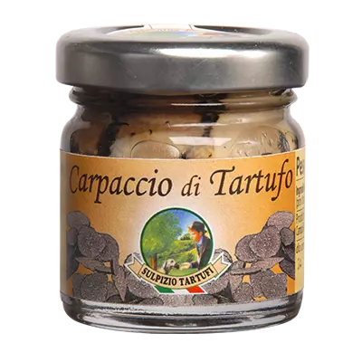 Il carpaccio di tartufo nero estivo in acqua, olio, sale e aromi, è disponibile in vasetti di vetro di diversi formati.
