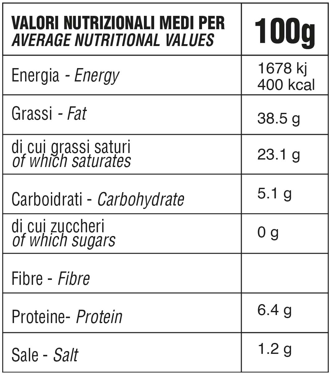 Ingredients: panna 48%, burro, latte, uova, acqua, tartufo bianco 2% (Tuber Magnatum Pico), tartufo bianchetto (Tuber Borchii), formaggio grattugiato (latte, sale, caglio), sale, cornstarch, aromi.