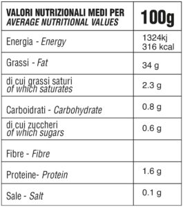 Ingredients: Olive nere 65% , olio di oliva, tartufo nero pregiato 3% (tuber melanosporum), tartufo estivo (Tuber Aestivum), olio extra vergine di oliva 38%, sale,  pasta di acciughe, cornstarch, pepe bianco, aromi, acido lattico, gluconato ferroso E579.