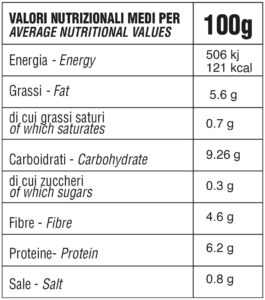 Ingredients: ceci 80%, tartufo nero 10% (Tuber Melanosporum, Tuber Moscatum de Ferry), olio di oliva, acqua, dado senza glutammato, sale, aroma.